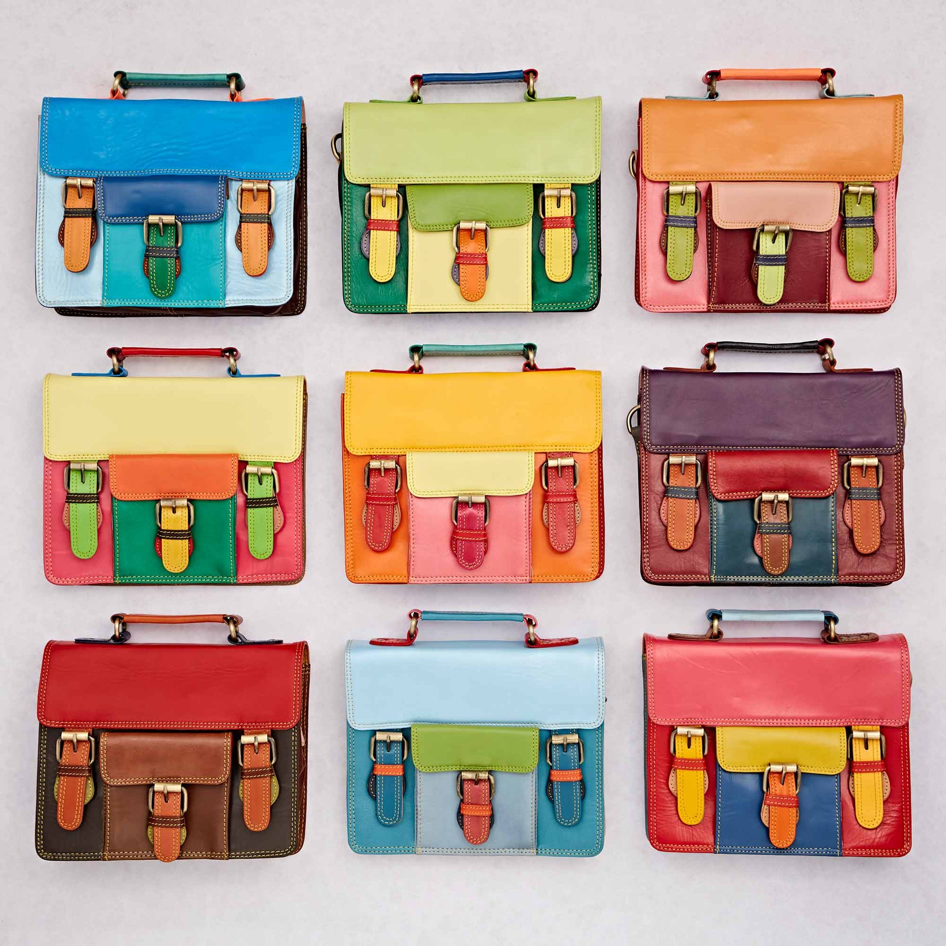 The Design: Handcrafted from recycled leather, each one is a unique patchwork of vibrant block colours.