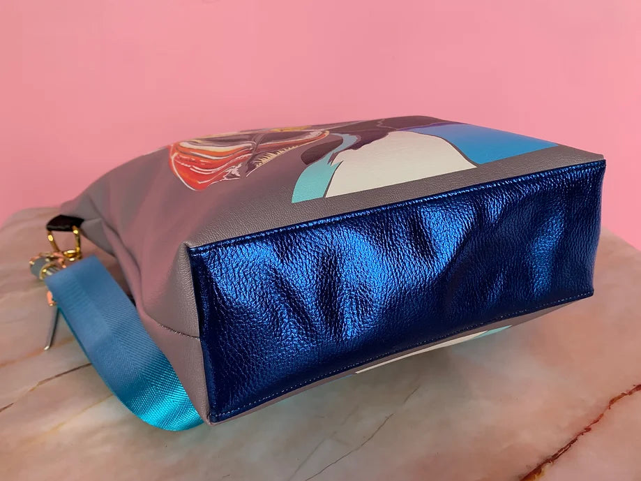 Why Unique? Original designs and vegan leather. Introducing a Chloe Croft vegan bag. They have a vegan leather coloured base and a faux silk coloured lining with a internal pocket and gold teeth zip.
