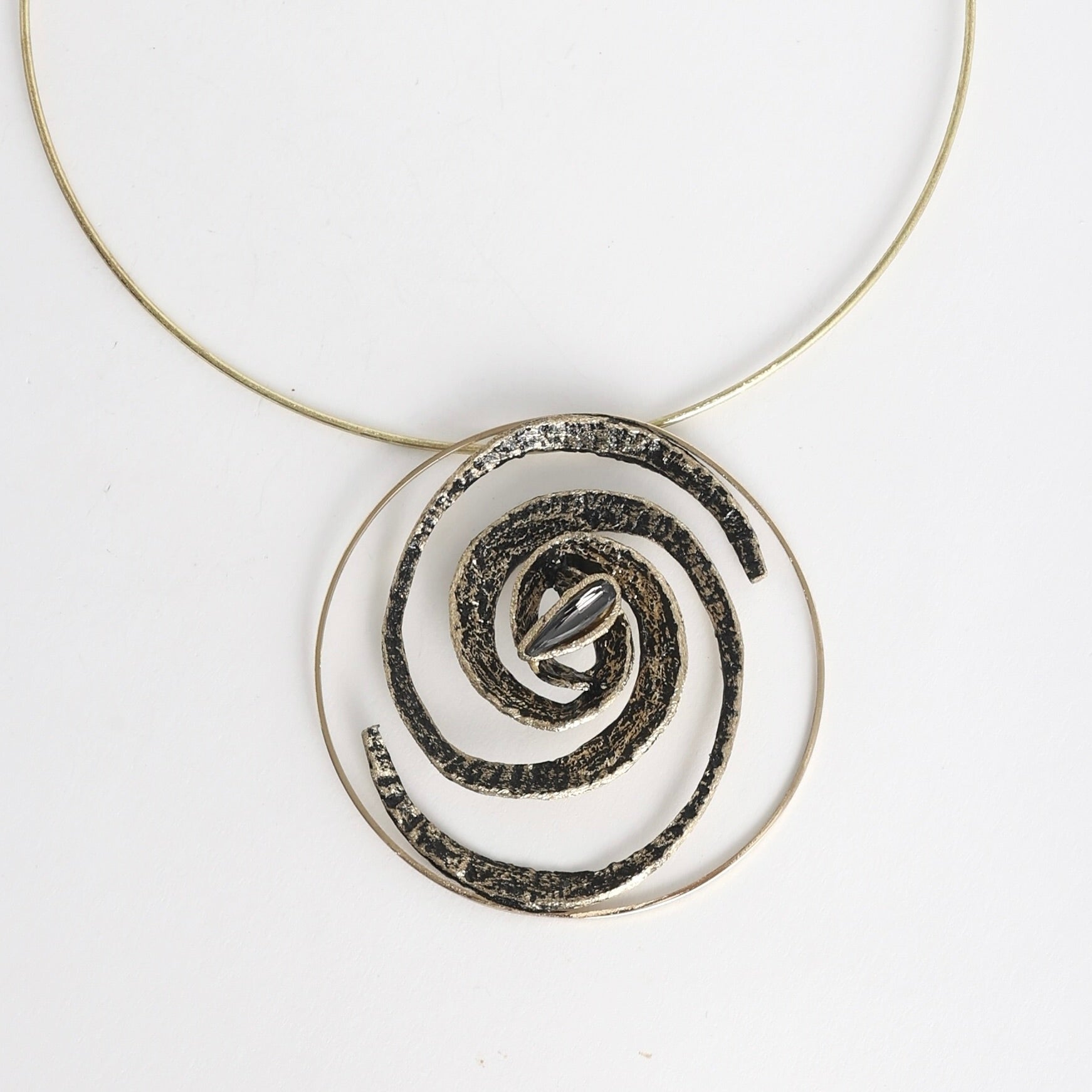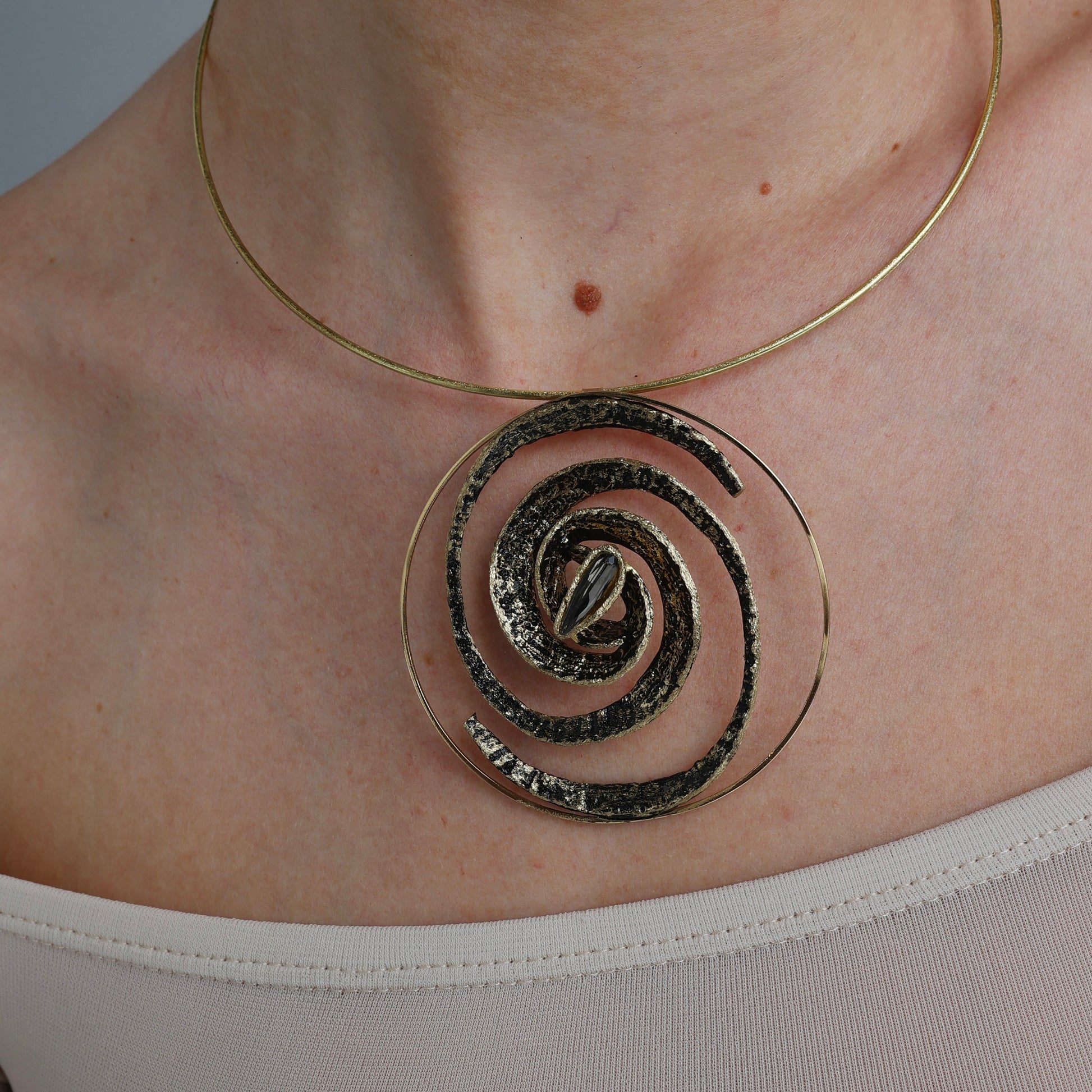 Description:  An ancient Greek jewelry design. A classic spiral bronze necklace set with a brilliant oversized Aqua Bohemica crystal.
